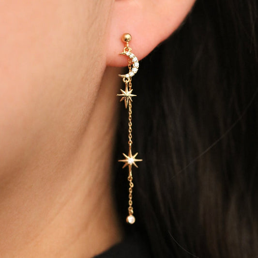 Cubic Moon Drop Chain Earrings