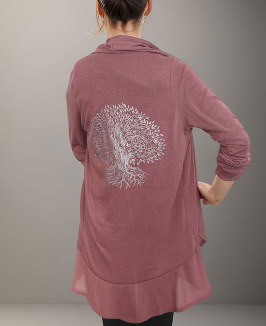 Light Weight Tree of Life Design Women's Long Sleeves Ruffle Cardigan in Dusty Rose