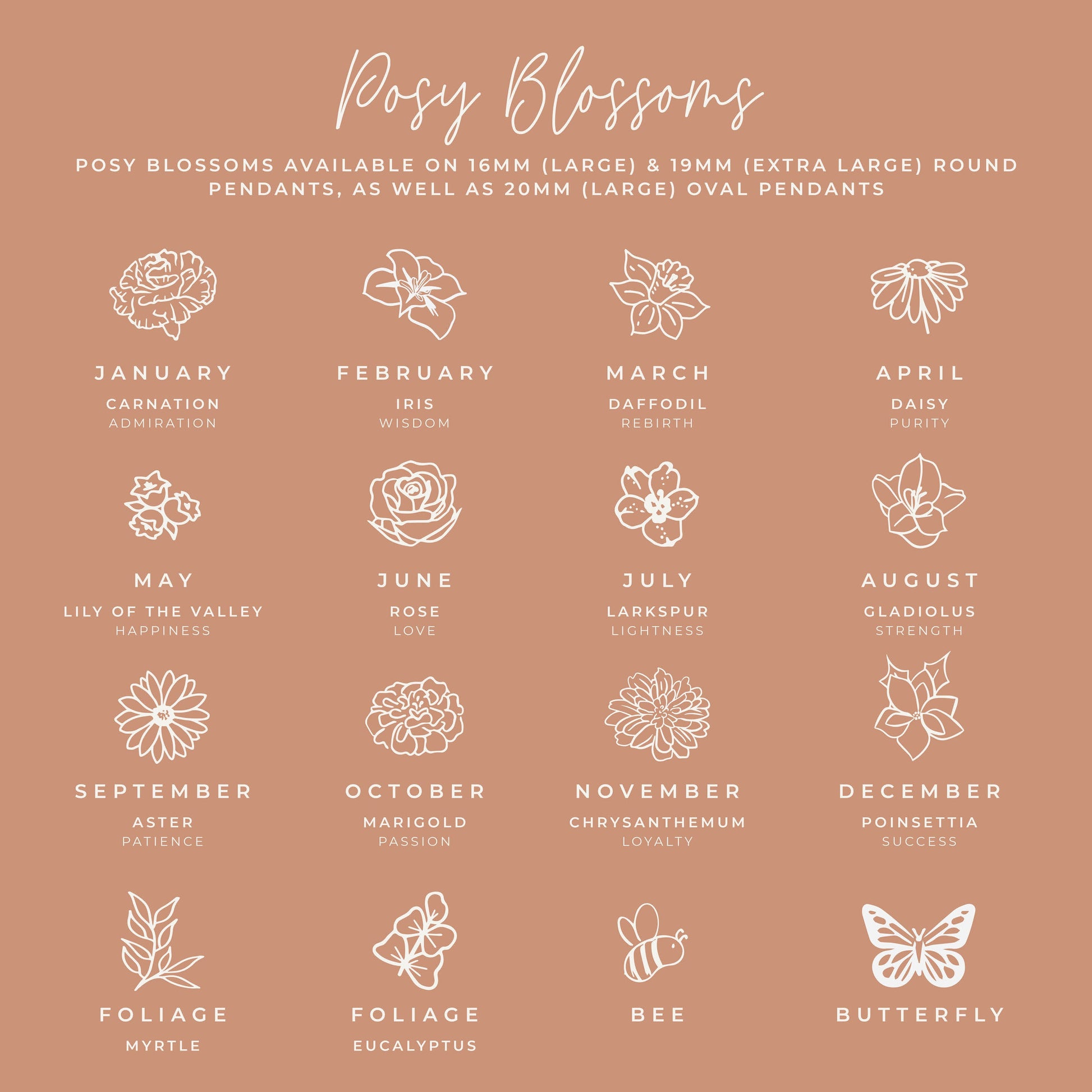 Featuring delicate bursts of floral beauty, our Blossom Posy Pendant is blooming with grace and elegance. Choose up to four Blossoms that represent the ones you love or simply your favourite combination of gorgeous flowers / foliage and let us design your beautiful bouquet that means the most.